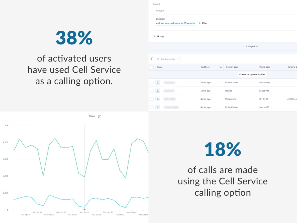 All in all this feature has been pretty successful. By using mixpanel to dig into user data, we are able to see that 38% of our activated users have used cell service as a calling option, and 18% of calls are made using the cell service calling option.