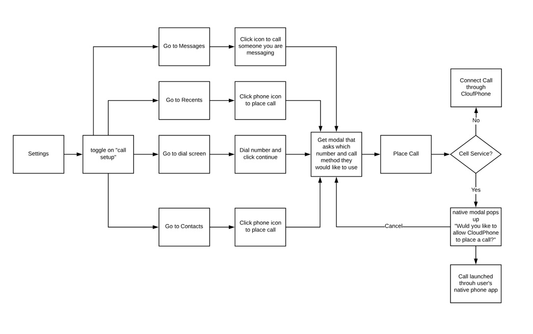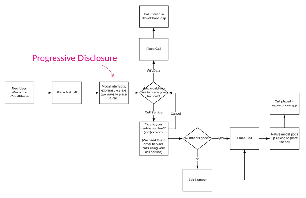 Here is a user flow I created for when someone places their first call in CloudPhone. Using progressive disclosure to not overwhelm the new user experience, we wait until the user is ready to place their first call before showing them these calling options.