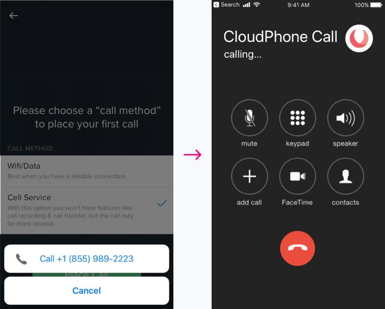 CloudPhone is a Voice Over IP (VOIP) provider that allows people to place and receive calls with a second phone number for their business. VOIP calling works great and has many advantages to normal calling, but only when you have a good wifi/data connection. Our customers were reporting call quality issues related to having a poor connection. The task here was to enable users to place calls using their regular calling app (which uses a cellular connection), but while using their business phone number instead of their personal number.