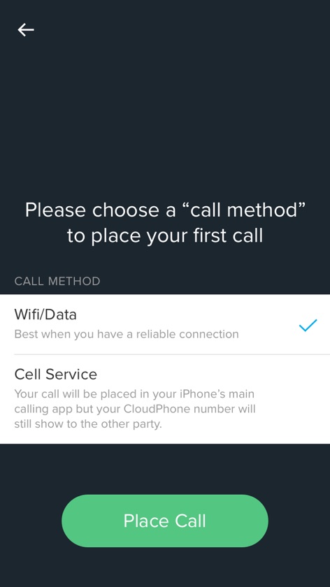 Before a user places their first call we ask them in this screen, “Please choose a “call method” to place your first call”. I spent a lot of time getting this messaging right. I was looking for a balance of clarity and briefness, explaining only what I needed to, so the text would be more likely to be read.