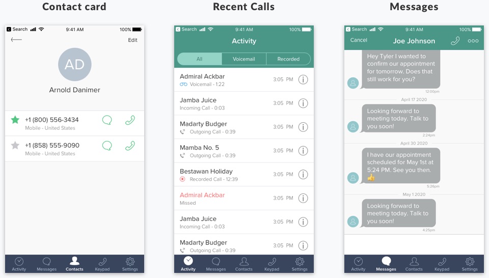 Showing the options to change call method on the keypad isn’t enough, because there are several other areas where calls can be placed. I needed a more comprehensive design solution so that users could choose their call method when initiating a call from Contact Card, Recent Calls, and Messages.