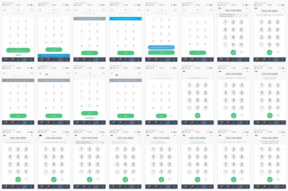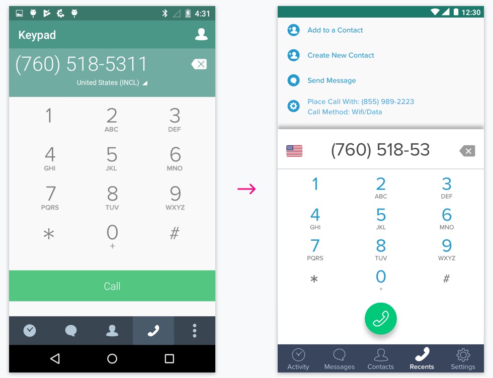 I’m mostly showing the designs I made for our iOS app, but I made a tailored set of decisions for our Android app. The new design on the right uses Material Design guidelines, and is similar aesthetically and functionally to the Android native calling app. This was paired with a larger UI update to our Android app to make it feel more Android native.