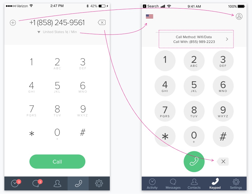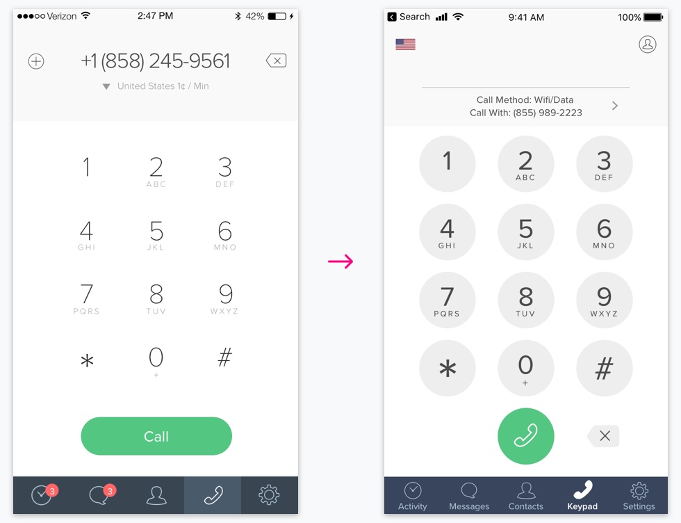 Here is a before and after that shows how I transformed the keypad screen to make room for an option to change their call method. The screen on the right shows the new screen.