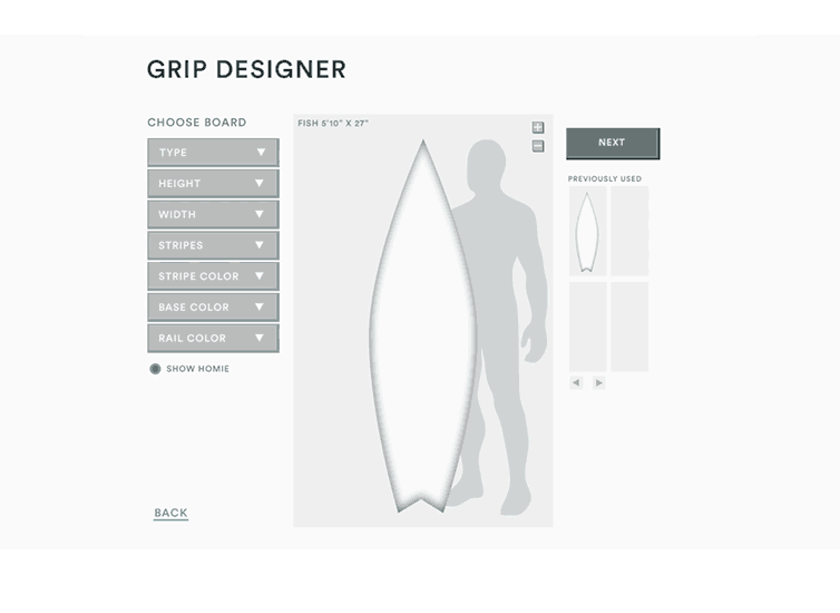 The Grip Designer is an e-commerce concept project that allows customers to put together a custom package of self-adhesive foam cutouts for their surfboard. These foam stickers provide traction while surfing and are an alternative to surf wax. I created a prototype that allows customers to set the dimensions of their board, and create a layout of how they want their board to look using TRXN's available foam stickers. Once the user is done designing, they can calculate the total cost of the stickers they've used, and click "add to cart" when they're satisfied.