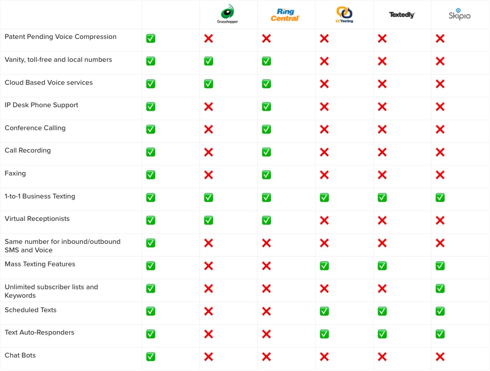 This is a feature comparison chart that shows how we positioned VoxDirect compared to other top providers in the text marketing space and cloud-based phone system space.