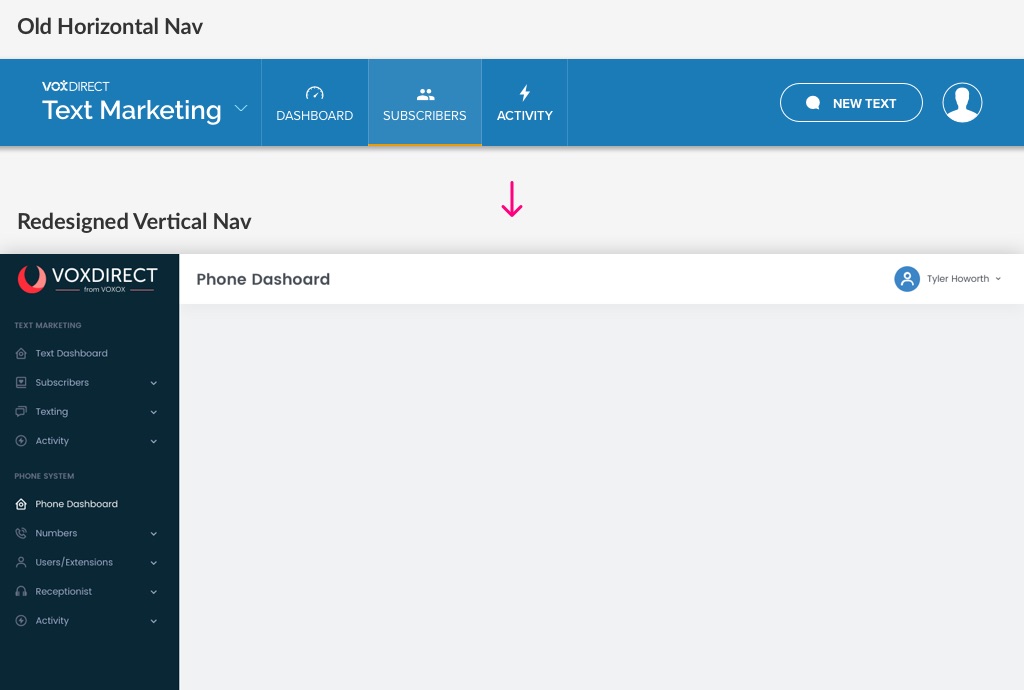 One of the biggest usability issues I identified was our navigation was confusing. We originally designed VoxDirect to be two separate products that could be independent of one another. So we had a “Phone System” product and a “Text Marketing” product. So the idea was that you could switch between the two products by hovering over the logo and selecting the other product from a drop down. We later decided to only market the combined version of the two products and I had an opportunity to redesign the navigation.