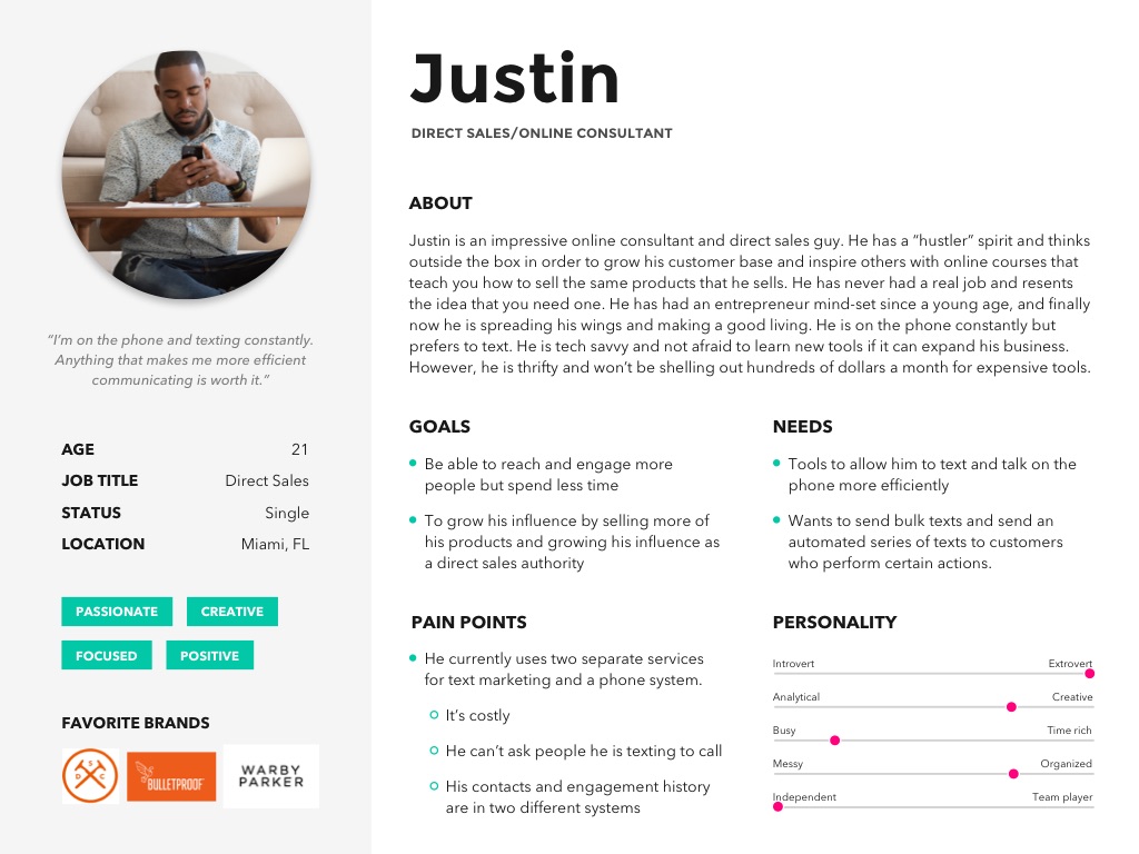Through the exercises shown above, I created several personas based on real user data. This is Direct Sales Justin. He’s an extroverted 21 y/o who is a natural salesman. He is constantly on the phone and texting so anything that can save him time and make him look more professional is worth considering.