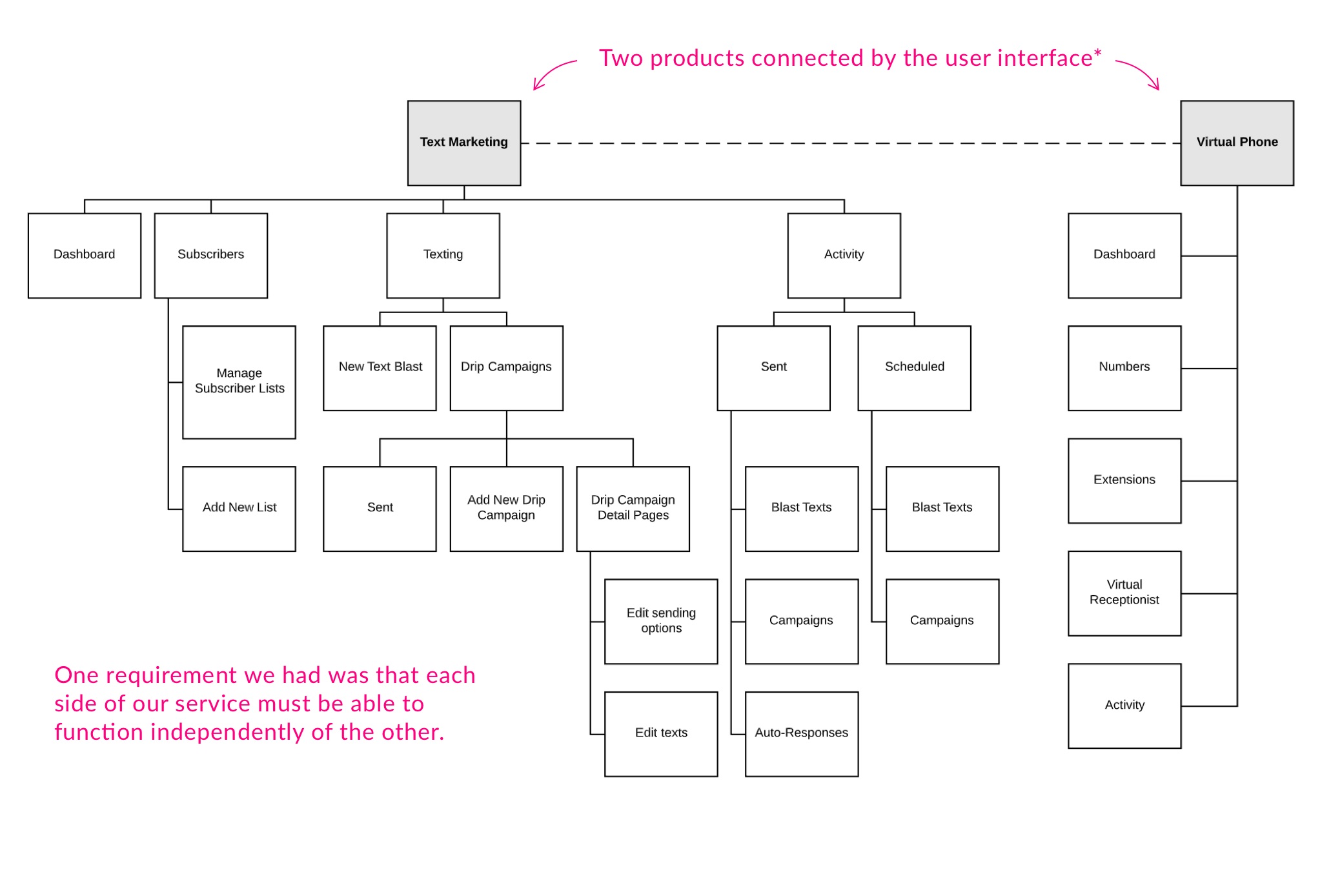 After the initial research phase, I started designing in low-fidelity and putting together a site map. On the right is the pre-existing phone system side of our product. On the left, are the new text marketing features.